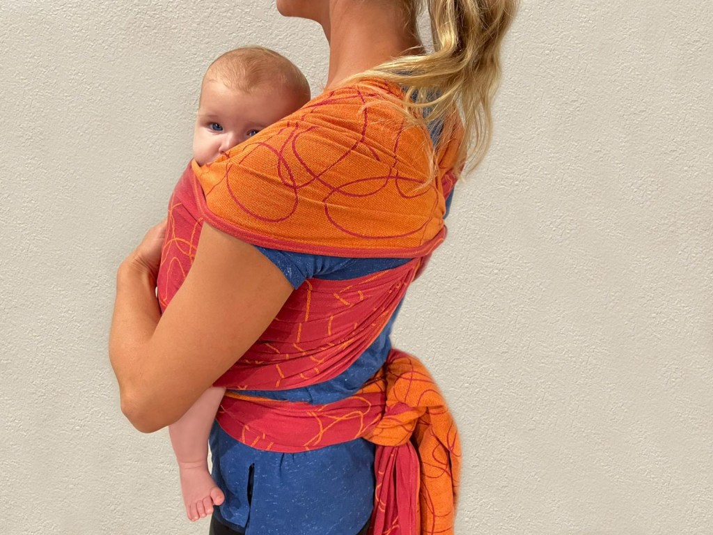 Carrying your baby is the most natural thing to do. They have been carried for 9 month. They are used to hear your heart beat and your breathing. Baby wearing provides a secure and safe environment for your baby and helps them to built self-perception and get used to the new world around them. These sweet young humans benefit enormously from being carried – bonding, developing a natural sleep rhythm and digesting are improving a lot when they are so close to you. Also – by using a wrap or a sling you support your own body recovering after giving birth by getting stronger through carrying your baby close to your body. But no worries – to “put on” a wrap is easier than you think.